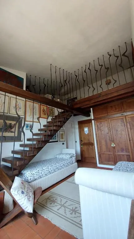 Camera accogliente di circa 18 m², con letto matrimoniale e bagno privato. Ideale per coppie, con arredi antichi e vista giardino.